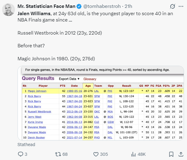 5.杰威与SGA一同拿到30+,NBA历史最年轻的总决赛30+组合;