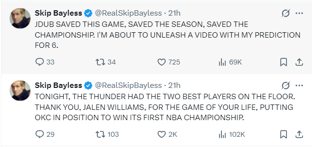 名嘴斯利普-贝勒斯在赛后高呼:杰威拯救了比赛,他拯救雷霆这个赛季,也拯救了他们的总冠军之旅。